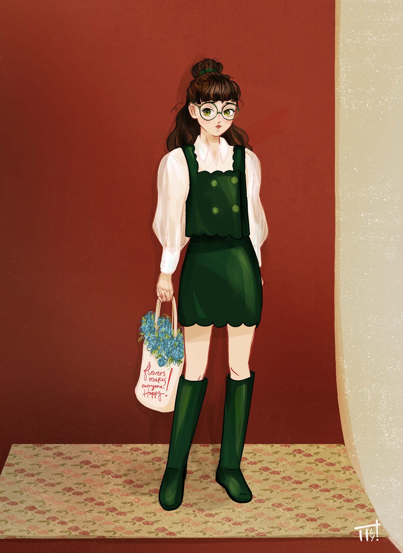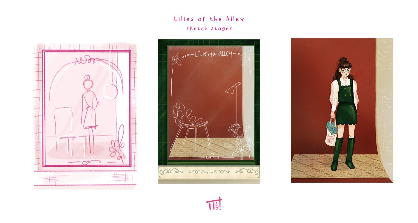 I remembered a photoshoot for a magazine with girls on a showcase and I run with that idea for a flowershop.